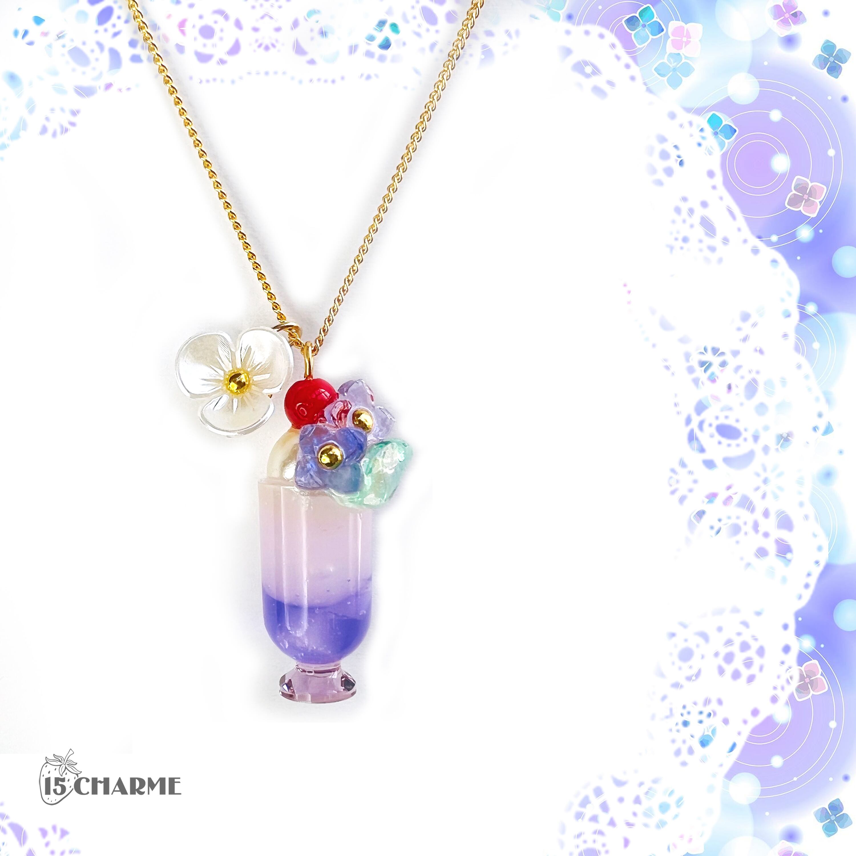 濃いパープルとミルキーパープルの2層になった紫陽花ドリンクに、パールのアイスクリームとサンゴのさくらんぼをのせました♪